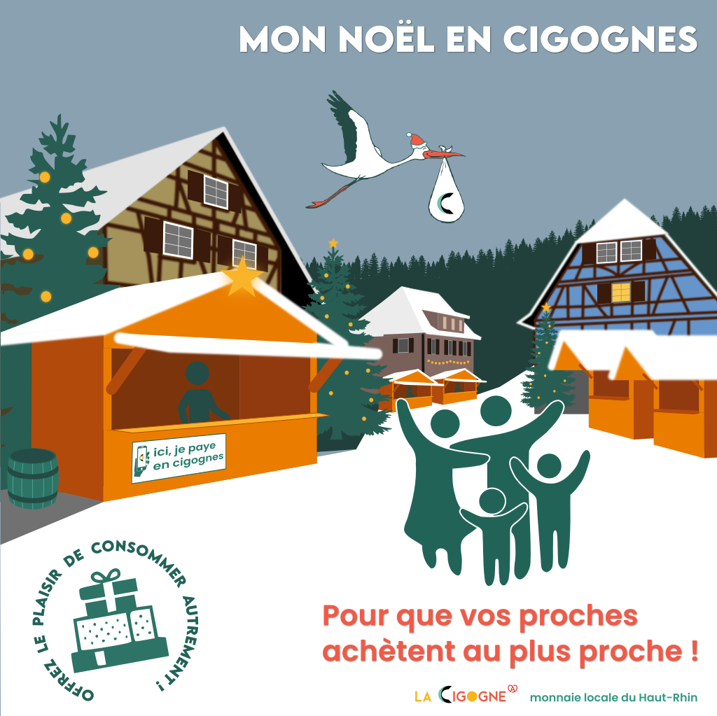 Eh bien, si cette personne vit dans le Haut-Rhin et que les mots économie locale, circuits courts, durabilité, solidarité et engagement résonnent en elle, nous avons la solution. Permettez-lui de faire son « Noël en cigognes », la monnaie locale du Haut-Rhin, au service d’un territoire plus robuste.